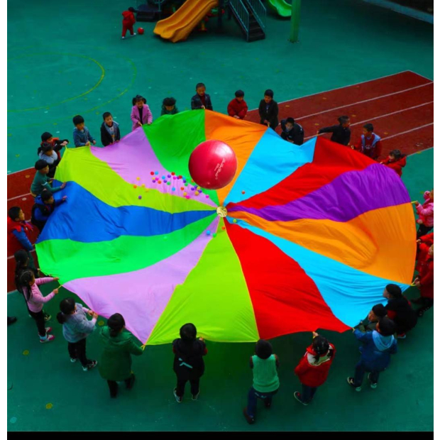 真人球來運轉:以小朋友一起拉起大圓布,讓大球在中間滾動之遊戲。